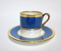 英国ウエッジウッドのデミタスカップ&ソーサー(W745)で、ユーランダーシリーズ同様に美しいパウダーブルーと金彩バンド、細かな装飾などとても手の込んだエレガントで魅了する作品。